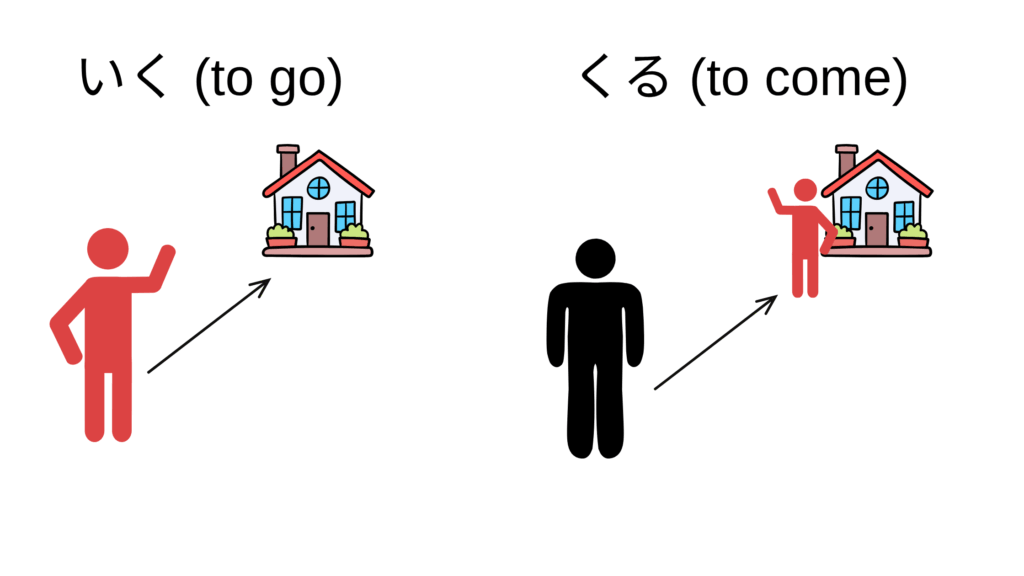 The verb “いく” (to go) describes the speaker’s own movement, while “くる” (to come) usually refers to the other person’s movement.